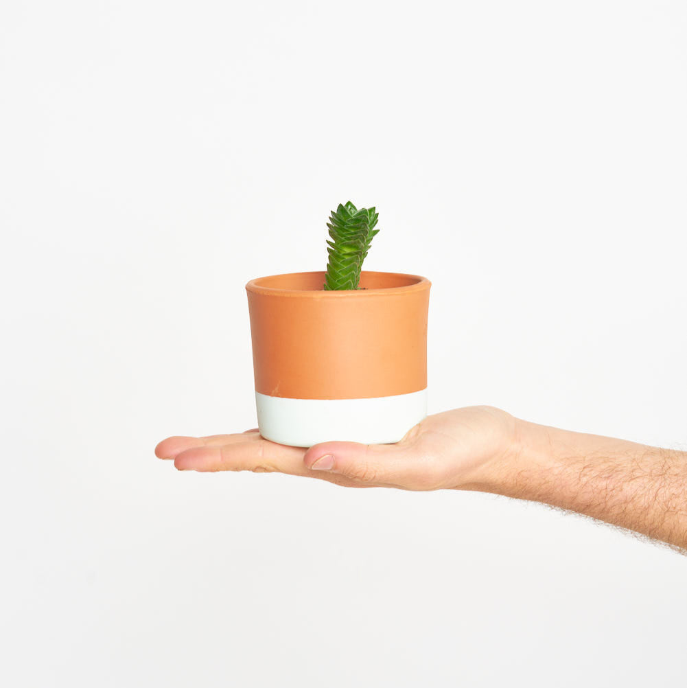 - No están incluidas las macetas de barro que veis en las fotos, pero sí te enviamos cada mini planta con su maceta de plástico reciclado para que al menos las primeras horas tenga un sitio donde reposar y esté bien protegida la raíz durante el trayecto.