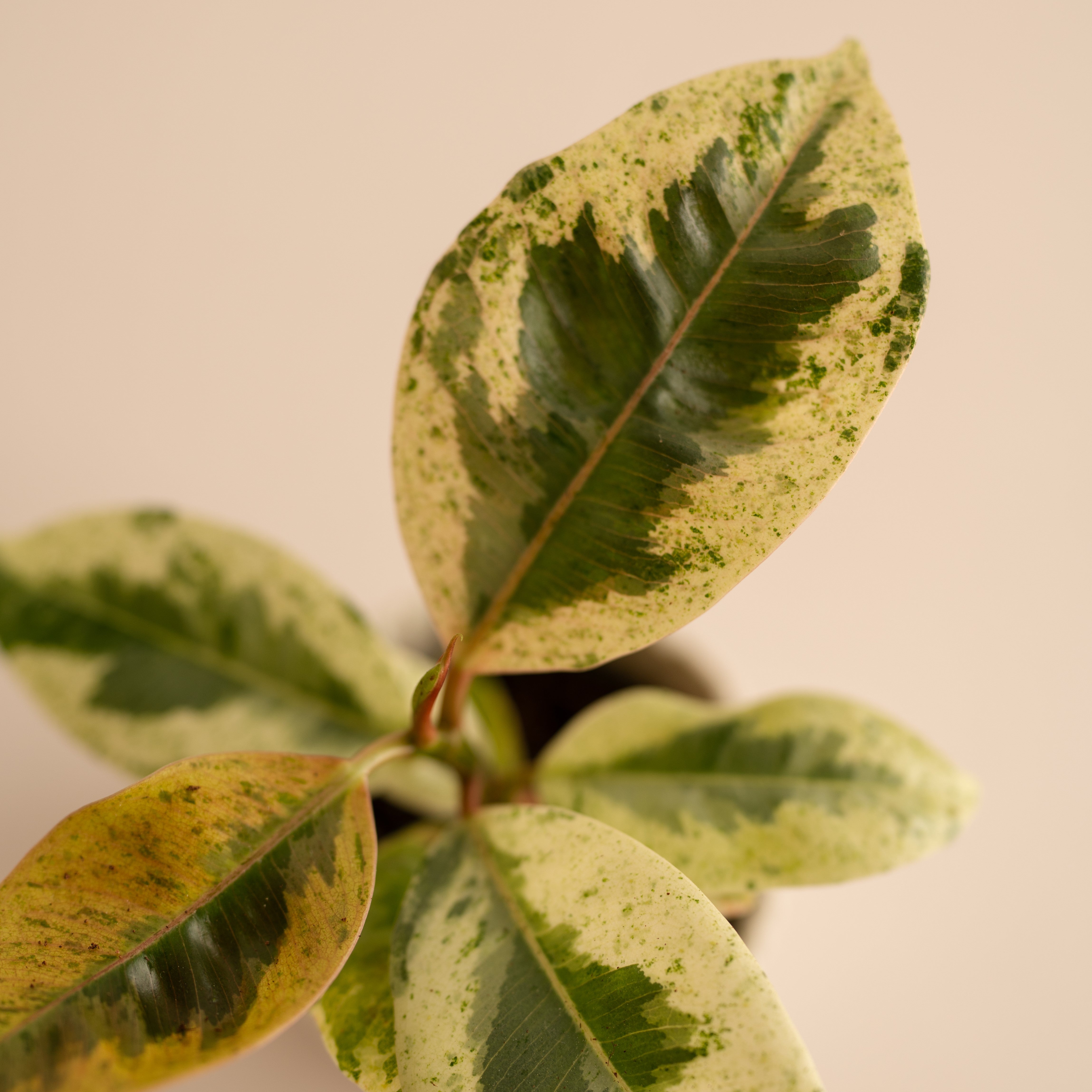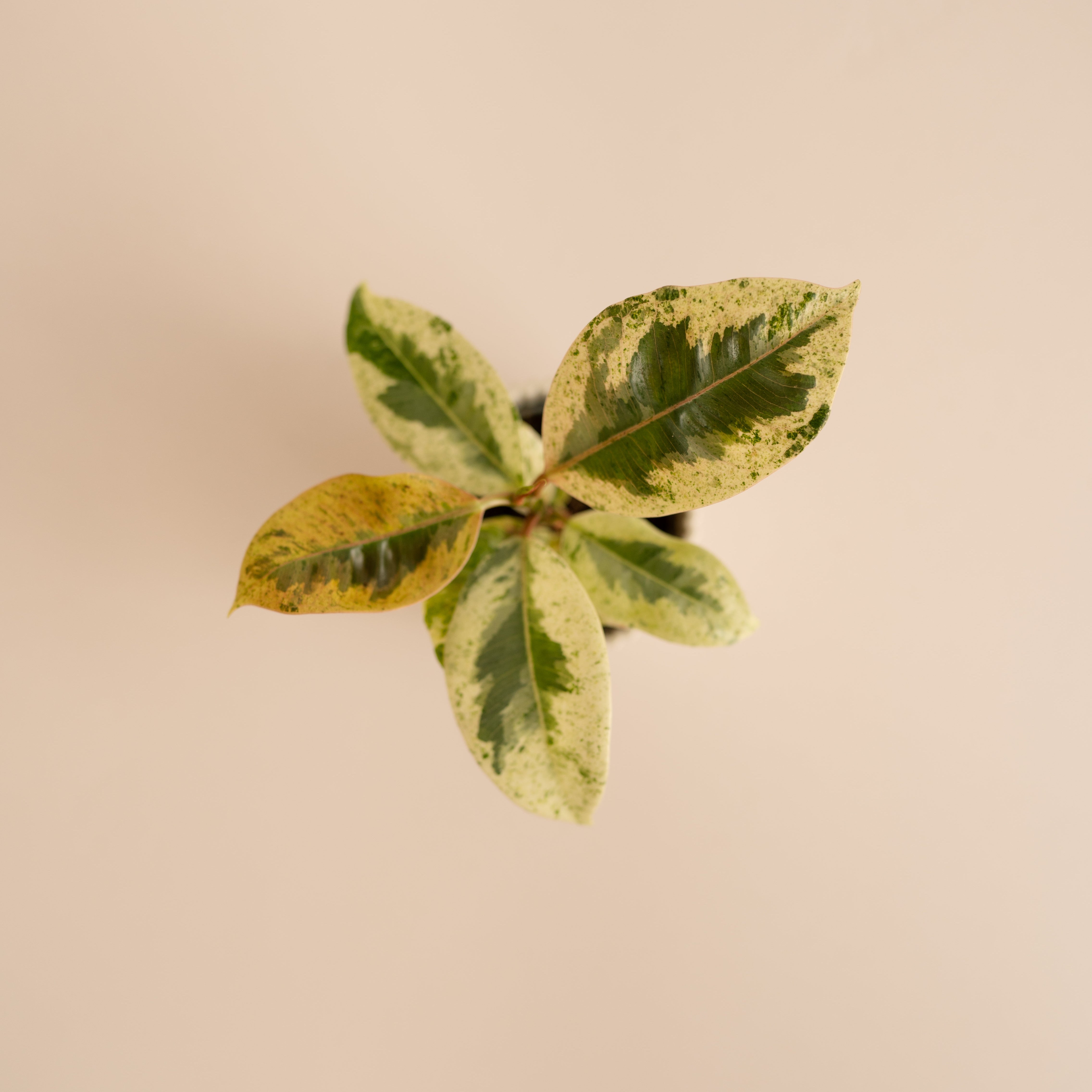 El Ficus Variegata Elástica Schrijveriana, conocido por sus impresionantes hojas variegadas que combinan tonos verdes y amarillos, es la variedad más especial y difícil de conseguir del popular ficus elástica, por su variegación tan especial.